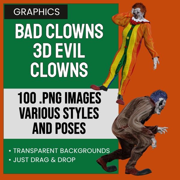Bad Clowns is a collection of 100 transparent PNG images of a variety of toon style clowns in various styles and poses.